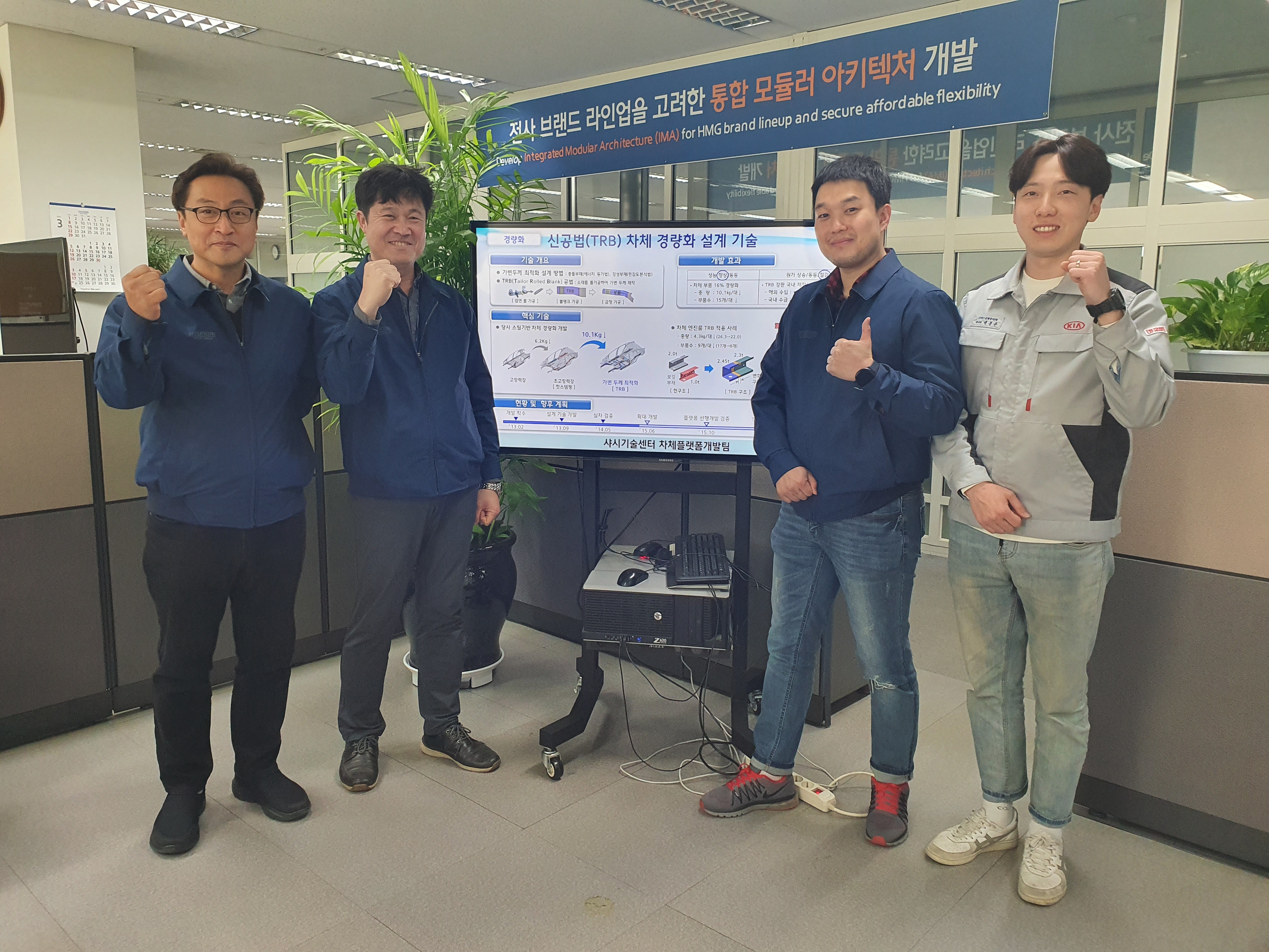 ![]() △왼쪽부터 김윤창 팀장, 정희석 책임, 최봉원 책임, 백종윤 매니저. 현대자동차가 개발한 `다중두께 자동차 차체 프레스 부품`이 2020년 24주차 iR52 장영실상을 받았다. 다중두께 자동차 차체 프레스 부품은 자동차 뼈대를 이루면서 운전자 주행 안전성을 보장해주는 제품이다. 이 차체를 이루는 뼈대들은 강성·강도가 적절해야 주행 시 안전하고 충돌할 경우 차체 변형이 최소화된다. 강성이란 재료가 주어진 변형에 저항하는 정도를 뜻한다. 현대자동차 다중두께 자동차 차체 프레스 부품은 자동차 산업 미래인 전기차 보편화를 염두에 두고 차체를 경량화하는 과정에서 개발됐다. 밀도가 낮은 알루미늄 소재나 플라스틱 복합재 CFRP 등은 차체 사용 시 재료비가 높아지고 안전성은 도리어 떨어지기 때문에 고려 대상에서 뺐다. 정희석 현대자동차 바디인테그레이션팀 책임연구원은 "세계 최초로 차체 구간별 성능 분석 기법을 개발해 자동차를 경량화하는 데엔 경량화 재질만 써야 한다는 고정 관념을 타파하고자 했다"며 "독일 자동차 기술력을 웃도는 스틸 기반 경량화 기술을 국내 철강사와 협업해 개발할 수 있었다"고 밝혔다. 설계 기술 검증에만 35번이나 실패했다. 차체를 경량화하면서도 강성과 강도는 이전처럼 유지해야 했기 때문이다. 정 책임연구원은 "보강 부재를 추가하는 대신 자체 기술로 두께를 보강하는 게 더 효율적임을 거듭된 실패로 알게 됐다"며 "자동차 뼈대를 이루는 보강 부재들을 추가하지 않고 메인 부재들 두께만 일부 증가시키는 방법으로 강성·강도 유지 및 경량화를 모두 이룰 수 있었다"고 말했다. 경량화는 자동차 업계 최대 숙제로 꼽힌다. 차가 가벼워질수록 엔진이 부담해야 하는 무게가 줄고 연비 효율이 좋아지기 때문이다. 자연히 이산화탄소 등 유해물질 배출량이 줄어든다. 또한 자동차 고유 성능인 가속, 조향, 제동 성능이 향상되는 것을 의미하기에 국내외에서 경량화 차체 개발에 노력이 한창이다. |