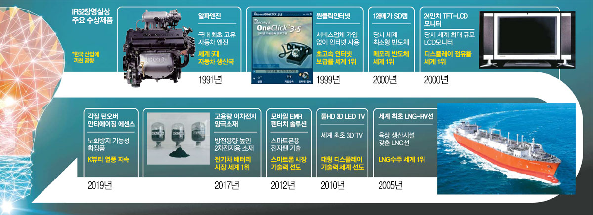 ![]() 수상작 통해 본 산업 발전史 포니에 日엔진 장착한 현대車 2005년 개발한 `세타엔진`으로 30년만에 獨·일본에 기술 수출 삼성전자 평면TV로 시장 주도 40인치 LCD로 세계 1등 차지 2001년 수상 `256메가 SD램` 글로벌 메모리시장 뒤흔들어 ◆ 장영실상 30주년 ② ◆ 1991년 1월, 현대자동차에서 대한민국 최초의 독자 개발 엔진인 알파엔진이 개발됐다. 이 엔진이 개발되기 전까지는 한국 브랜드를 단 자동차도 일본에서 만든 심장(엔진)으로 움직였다. 알파엔진은 같은 해 제정된 'IR52장영실상' 1회 수상의 영예를 안았다. 1994년에는 한국 독자 기술로 자동차 배기가스 정화시스템이 개발돼 같은 해 37주 차 IR52장영실상 수상 제품에 선정됐다. 이러한 국내 기업들 노력에 힘입어 1995년 한국은 세계 5대 자동차 생산국이 됐다. 2005년 현대자동차가 개발한 '세타엔진'(2005년 3주 차 수상)은 일본 미쓰비시와 독일 다임러 크라이슬러에 기술을 수출하며 세계 시장에서 기술력을 인정받았다. 일본 미쓰비시 엔진을 기반으로 만든 포니(1975년)를 생산한 지 30년 만에 자동차 기술에서 새로운 역사를 쓴 셈이다. 이처럼 장영실상은 대한민국 산업 역사에 큰 획을 그은 제품들에 핵심적인 '성장 발판' 역할을 했다. 경제성·독자성·기술적 자립도·기술 응용성과 파급효과가 우수한 국내 개발 제품을 시상하는 상이니만큼 IR52장영실상 수상 기술의 역사는 한국 산업기술 발전사를 그대로 보여주는 '거울'이기도 하다. 1999년 첫 주의 장영실상 수상 제품은 대한민국이 원조가 된 MP3 플레이어였다. 오디오파일을 음질 저하 없이 12분의 1로 압축하는 MP3 기술은 이전에도 있었지만, 당시에는 이 파일을 CD에 저장해 컴퓨터로 들어야만 하는 불편함이 있었다. 하지만 엠피닷컴은 MP3파일을 직접 재생할 수 있는 디지털 기기를 선보이며 세계에 한국의 기술력을 알렸다. 같은 해 23주 차 수상 기술인 '원클릭 인터넷 기술'은 2002년 한국 초고속 인터넷 보급률 1위라는 기록으로 이어졌다. 이를 비롯해 1990년대 후반~2000년대 초반에는 정보통신 분야의 신청과 수상 실적이 크게 늘어났다. IR52장영실상 수상을 통해 한국 TV 산업 발전 과정을 들여다보는 재미도 있다. 1995년 삼성전자는 당시 기존 TV보다 편평하면서도 영상이 일그러지지 않는 '명품TV'를 개발해 장영실상을 받았다. 이듬해인 1996년 4대3이었던 TV의 가로·세로 비율을 12.8대9로 바꾼 '명품 플러스원 TV'가 개발돼 IR52장영실상을 받았고, 1999년에는 '완전 평면 TV'가 나왔다. 2000년 19주 차 수상 제품인 '디지털 PDP TV'는 당시 세계에서 가장 얇은 TV를 구현해내 주목받았는데, 이 TV 두께는 7.8㎝였다. 2000년 36주 차 수상 제품인 'TFT-LCD모니터'와 2002년 38주차 수상 제품인 '40인치 LCD TV' 등장은 2004년 한국의 세계 LCD 시장점유율 1위라는 결과로 이어졌다. 한국이 써내려간 반도체 산업의 빛나는 역사 역시 장영실상을 통해 돌아볼 수 있다. 2001년 44주 차 장영실상 수상 제품인 256메가 SD램은 당시 세계 메모리 시장에서 주력 제품이었던 128메가 D램을 급속히 대체한 제품으로 개발 비용만 2000억원에 달했다. 이후 삼성전자가 2003년 장영실상을 수상(17주 차)한 90나노급 1Gb 낸드플래시 메모리는 이른바 '황의 법칙'의 시초가 됐다. 2000년대 중반 실리콘 웨이퍼, 메모리 기판 소재 등의 반도체용 특수수지의 수상이 이어지면서 세계 최고 자리에 올라섰음에도 반도체 성능 향상을 위해 애쓰는 기업들의 노고가 알려졌다. 2000년대 후반부터는 스마트폰 기술 시장을 선점하기 위해 대한민국 기업들이 치열하게 기술을 개발한 흔적을 엿볼 수 있다. 2009년 10주 차에 2세대 위성통신단말기가 장영실상을 통해 부각됐고, 2012년 38주 차에 모바일 펜터치 기술, 같은 해 마지막 주에는 차세대 스마트폰이 수상의 영예를 안았다. IR52장영실상 역사는 한국 산업 전반뿐만 아니라 기업의 역사를 반영하는 거울이기도 하다. 디스플레이 전문 기업을 표방하던 삼성SDI의 경우에는 1990년대까지 브라운관과 PDP 등 분야에서 장영실상을 수상했다. 하지만 2000년대 이후에는 리튬이온전지 기술에서 장영실상을 다수 수상했다. 최고의 '브라운관 제조업체'가 세계적인 2차전지 기업으로 도약하는 과정을 IR52장영실상을 통해 확인할 수 있는 셈이다. |