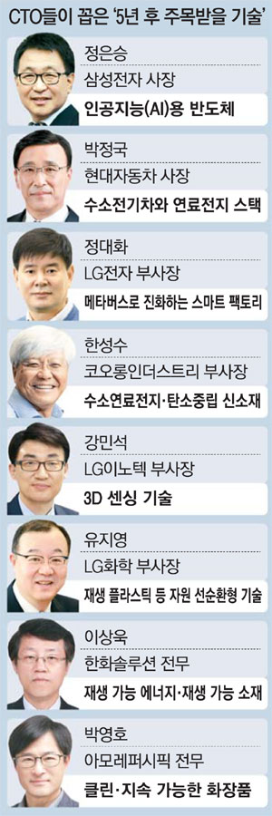 ![]() ![]() 삼성·현대차·LG·한화 등 8개 기업에 물어보니 삼성전자, AI반도체 주목 딥러닝 적용해 빅데이터 처리 LG, 가상 스마트팩토리 선정 AR·VR 활용해 혁신 가속화 현대차, 연료전지스택 집중 車는 물론 기차·선박에 활용 국내 주요 기업들이 메타버스 등 3차원 가상세계가 만들어내는 새로운 세상에 주목하고 있는 것으로 나타났다. 이를 실현하기 위한 인공지능(AI) 반도체와 3차원(3D) 센싱기술을 비롯해 다양한 기술에 관심을 갖고 관련 분야를 선점하기 위해 노력하고 있었다. 매일경제와 한국산업기술진흥협회는 최근 IR52 장영실상 30주년을 맞아 국내 8개 주요 기업 최고기술책임자(CTO)들에게 '5년 뒤 가장 유망한 미래 기술'에 대해 물었다. 이들은 각자의 분야에서 기업이 나아가야 할 방향을 제시하는 기술사령탑이다. IR52 장영실상의 30년 역사를 되돌아보면 대한민국을 이끌어온 산업의 트렌드와 시대별 변천사를 한눈에 볼 수 있다. 이번 설문조사에서 CTO들은 AI의 '뇌' 역할을 하는 AI 반도체와 메타버스를 기반으로 한 스마트팩토리, 이미지 인식 기술인 3D 인식 기술, 수소전기차와 수소연료전지, 생분해성 플라스틱 등 친환경 소재를 주요 유망 기술로 꼽았다. 삼성전자가 주목하는 유망 기술은 AI용 반도체다. 정은승 삼성전자 DS부문 CTO(사장)는 "자율주행·메타버스 등 AI 산업 응용 분야가 지속적으로 확대되면서 AI 반도체 시장의 급성장이 예상된다"고 밝혔다. 그는 "궁극적으로는 인간의 뇌를 모방한 아날로그 뉴로모픽(Neuromorphic) 칩을 통해 기존 반도체 칩이 갖는 전력 문제 등을 해결하는 등 AI 반도체 분야에서 한 단계 도약이 있을 것"이라고 덧붙였다. 컴퓨터 칩은 기억을 하는 메모리 소자와 계산을 하는 연산 소자로 나뉜다. 반면 사람의 뇌는 약 1000억개의 신경세포와 10~1000조개의 시냅스(신경세포 사이 공간)를 통해 기억과 연산을 병렬로 동시에 수행한다. 그럼에도 불구하고 적은 에너지를 소모할 뿐 아니라 전기적인 간섭도 없다. 뉴로모픽 칩은 정보의 저장·처리를 병렬로 수행하는 인간의 뇌를 모방하고 이를 통해 전력소비도 크게 낮춘다. 정대화 LG전자 생산기술원장(부사장)이 꼽은 미래 핵심 기술은 메타버스를 활용한 스마트 팩토리다. 정 부사장은 "자동화 공정에 빅데이터와 원격제어 기술이 적용돼 공장이 지능화되면서 효율성이 높아지고 있다"며 "향후에는 게임과 엔터테인먼트 산업에서 주로 사용되는 증강현실(AR)·가상현실(VR)과 같은 혼합현실(XR) 기술을 활용한 메타버스가 제조 산업에도 적용될 것"이라고 밝혔다. 메타버스가 향후 제조 현장에도 적용되면 작업자들이 물리적 공간을 초월해 공장의 가동 현황, 부품 재고 상황을 쉽게 파악하고 작업 과정의 오류를 예측해 최소화할 수 있을 것이라는 게 정대화 부사장 판단이다. 입체적으로 이미지를 인식하는 기술인 '3D 센싱 기술' 역시 메타버스의 등장으로 크게 각광받는 미래 기술이다. 강민석 LG이노텍 부사장은 "메타버스는 3D 센싱 기술을 활용하는 분야 중 가장 눈여겨봐야 할 것"이라면서 "AR·VR가 콘텐츠, 하드웨어, 소프트웨어와 결합되고 여러 글로벌 리딩 업체가 이를 플랫폼 형태로 제공하며 산업을 키워가고 있다"고 설명했다. 사람들이 즐길 수 있는 콘텐츠의 중심이 AR·VR로 옮겨지고 가상과 현실의 경계가 허물어지면서 3D 센싱도 향후 5년간 가장 빠른 성장이 예상되는 분야가 될 것이라는 게 LG이노텍 전망이다. 현대자동차는 머지않은 미래에 수소전기차가 전기차와 함께 기존의 내연기관을 대체할 축으로 자리 잡을 것이라고 내다봤다. 박정국 현대자동차 사장은 "이미 시장에 수소전기차가 출시됐고, 시장이 성숙되면 규모의 경제로 가격 경쟁력도 갖추게 될 것으로 보인다"고 밝혔다. 수소연료전지는 기차·트램·선박 등의 동력원에도 활용될 수 있기 때문에 연료전지를 여러 개 연결한 '연료전지 스택' 역시 각광받을 것이라는 게 박 사장의 기대다. 화학 분야에서는 친환경·탄소중립이 가장 중요한 미래 기술로 꼽혔다. 이상욱 한화솔루션 전무는 "미래 화학산업 플레이어들은 친환경 기술개발과 에너지원 발굴에 공력을 들일 것"이라고 밝혔다. 코오롱인더스트리가 주목하는 미래 분야 역시 수소에너지와 생분해성 플라스틱 등 탄소중립과 관련된 기술이다. 한성수 코오롱인더스트리 CTO(미래기술원장)는 "수소연료전지 자동차용 수분제어 장치와 수소연료전지 핵심 부품인 막전극접합체(MEA) 양산 설비를 구축하는 등 수소 관련 산업 통합 솔루션 기업으로 자리매김하고자 한다"고 밝혔다. 플라스틱 생산·규제가 강화되고 있는 가운데 기존 플라스틱을 대체할 생분해 플라스틱 양산도 중요한 과제 중 하나다. 한 원장은 "글로벌에서 환경 문제가 부각되고 관련 규제도 강화되고 있는 만큼 환경오염 주범인 플라스틱을 대체할 친환경 소재 연구가 활발히 이뤄지고 있다"고 설명했다. 유지영 LG화학 부사장도 친환경 플라스틱을 비롯한 '자원 선순환형' 기술이 미래에 가장 각광받을 것이라고 밝혔다. 유 부사장은 "기존의 합성수지와 동등한 수준의 기계적인 물성과 유연성·투명성을 확보하면서 분해 기간까지 조절되