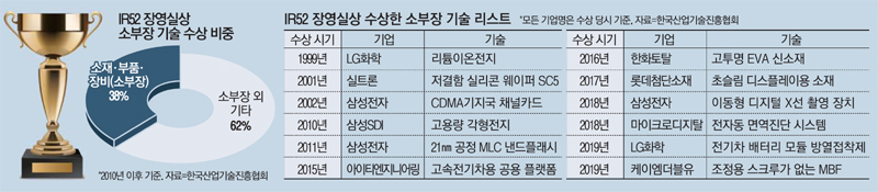 ![]() ◆ IR52 장영실상 30주년 ④ ◆ 2010년 이후 소부장 기업 수상 총 200곳 … 전체 수상자 38% 2019년 정부가 나서기 전부터 장영실상 소부장 중요성 주목 삼성전자 낸드·실트론 웨이퍼 LG 초소형 리튬전지가 대표적 KMW등 중견중기도 다수 배출 올해로 30주년을 맞은 IR52 장영실상은 국내 소재·부품·장비(소부장) 기술의 산실 역할을 톡톡히 해왔다. 정부가 소부장 산업을 정책적으로 주목하기 이전부터 유망 기술 발굴에 주력해 이른바 K소부장 경쟁력 향상에 기여했다는 평가를 받고 있다. 5일 한국산업기술진흥협회에 따르면 2010년 이후 소부장 분야에서 IR52 장영실상을 수상한 기업은 총 200개에 달했다. 같은 기간 전체 수상 기업의 38%가 소부장이었던 셈이다. 정부는 2010년 핵심 소재 개발을 지원하는 '세계일류소재개발(WPM)' 사업을 시행하며 처음 소부장 산업에 주목했지만, 점차 기억에서 사라진 뒤 2019년 7월 일본 수출규제 사태가 터지면서 다시 소부장 산업을 강조하기 시작했다. 하지만 기업들은 이 같은 정책적 변화와 관계없이 소부장 기술을 끊임없이 갈고닦으며 국내 소부장 산업 기반을 마련해 왔다. 실제로 지난 30년간 반도체, 2차전지, 석유화학, 이동통신 등 우리나라 산업을 이끄는 각 분야의 소부장 기술이 IR52 장영실상을 받았다. 전기차, 바이오, 5세대(5G) 이동통신 등 한국 산업의 미래를 이끌어나갈 소부장 기술도 장영실상을 거쳤다. 대표적으로는 삼성전자가 개발한 메모리 반도체 소부장 기술이 있다. 삼성전자는 '21나노미터(㎚) 공정 MLC(Multi Level Cell) 낸드플래시 메모리'를 개발해 2011년 52주차 IR52 장영실상을 수상했고 반도체 회로 폭 굵기를 줄인 '10㎚ 공정 MLC 낸드플래시'로 2013년 37주차 IR52 장영실상을 또 받았다. IR52 장영실상을 수상한 기술은 완제품인 삼성전자 솔리드스테이트드라이브(SSD) 출시로도 이어졌다. 실트론(현 SK실트론)은 반도체 핵심 소재 실리콘 웨이퍼를 개발해 IR52 장영실상을 받았다. 2017년 SK에 인수된 실트론은 IR52 장영실상을 2회 수상했다. 실트론은 '저결함 실리콘 웨이퍼 SC5'를 개발해 2001년 47주차 IR52 장영실상을 받았고 '극저결함 실리콘 웨이퍼'로 2007년 14주차 IR52 장영실상을 수상했다. 실트론은 꾸준히 성장해 2018년 매출 1조원을 돌파했다. 2차전지 분야에선 2010년 34주차 IR52 장영실상을 수상한 삼성SDI의 '고용량 각형전지'가 있다. 이 기술은 한층 기능이 향상돼 현재 삼성SDI의 전기차 배터리에 적용되고 있다. LG화학은 '리튬이온전지'를 개발해 1999년 IR52 장영실상 대통령상을 받았고, '초소형 리튬이온 배터리' 개발에 성공해 2016년 51주차 IR52 장영실상을 수상했다. 석유·화학 분야에선 2016년 13주차 IR52 장영실상을 수상한 한화토탈의 '고투명 에틸렌비닐아세테이트(EVA) 신소재' 기술이 있다. 태양전지의 핵심 소재로 수분이 전지로 침투하는 것을 막는다. 2017년 1주차 IR52 장영실상을 수상한 롯데첨단소재의 '초슬림 디스플레이용 하이브리드 소재'는 거울을 보는 것처럼 외관이 말끔한 TV 뒷면을 구현할 수 있다. 이동통신 분야에선 2002년 2주차 IR52 장영실상을 받은 삼성전자의 'CDMA기지국 채널카드' 기술이 대표적이다. 미래 산업인 전기차 분야에선 아이티엔지니어링의 '고속전기차용 공용 플랫폼' 기술이 2015년 17주차 IR52 장영실상을 수상했다. 이 기술은 국내 최초로 개발된 고속전기차 전용 개방형 공용 플랫폼이다. 2019년 24주차 IR52 장영실상을 받은 LG화학의 '전기자동차 배터리 모듈용 방열접착제'는 전기차용 배터리 셀을 보호하는 역할을 한다. 바이오 분야에선 혈액에 시약을 넣고 반응을 수치화해 질병을 검사하는 마이크로디지탈의 '정밀 광학분석 기반 전자동 면역진단 시스템'이 2018년 46주차 IR52 장영실상을 받았다. 삼성전자의 '이동형 디지털 X선 촬영 장치'도 2018년 12주차 IR52 장영실상을 수상한 바이오 장비다. 5G 분야에서는 이동통신 사업자 간 통신 간섭을 줄이는 케이엠더블유의 '조정용 스크루가 없는 마이크로 벨로우즈 필터(MBF)'가 2019년 28주차 IR52 장영실상을 받았다. |